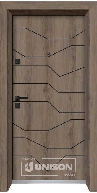 Входни врати Unison Laminor са проектирани с ясна насоченост към съвременната архитектурна визия и дългосрочната надеждност. Вратите се отличават с изразен стилен декор с двустранно устойчиво ламинатно покритие и здрава конструкция от структуриран алуминий. Вътрешността на крилото е запълнена с естествена каменна вата с висока плътност, осигуряваща отличен комфорт по отношение на топло- и шумоизолацията.