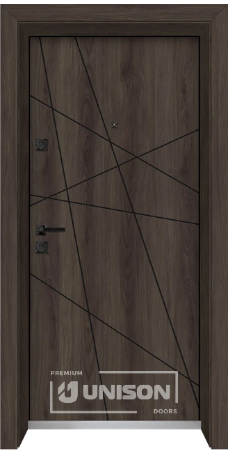 Входни врати Unison Laminor са проектирани с ясна насоченост към съвременната архитектурна визия и дългосрочната надеждност. Вратите се отличават с изразен стилен декор с двустранно устойчиво ламинатно покритие и здрава конструкция от структуриран алуминий. Вътрешността на крилото е запълнена с естествена каменна вата с висока плътност, осигуряваща отличен комфорт по отношение на топло- и шумоизолацията.